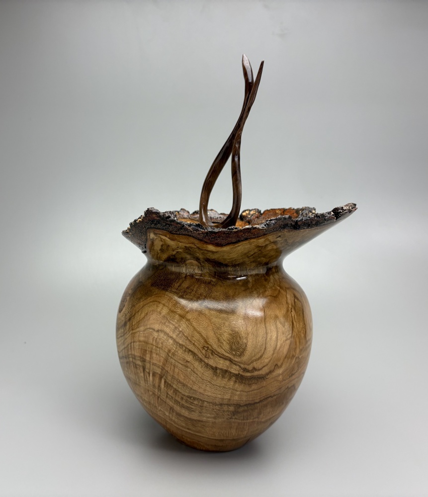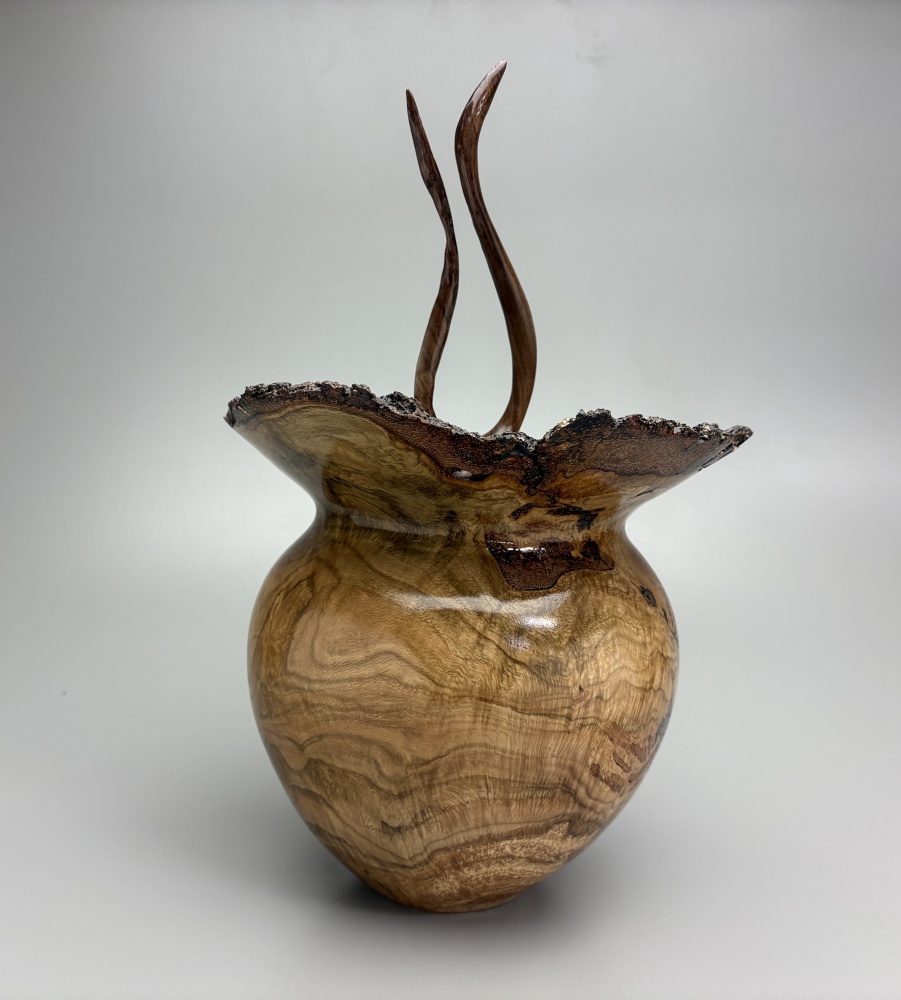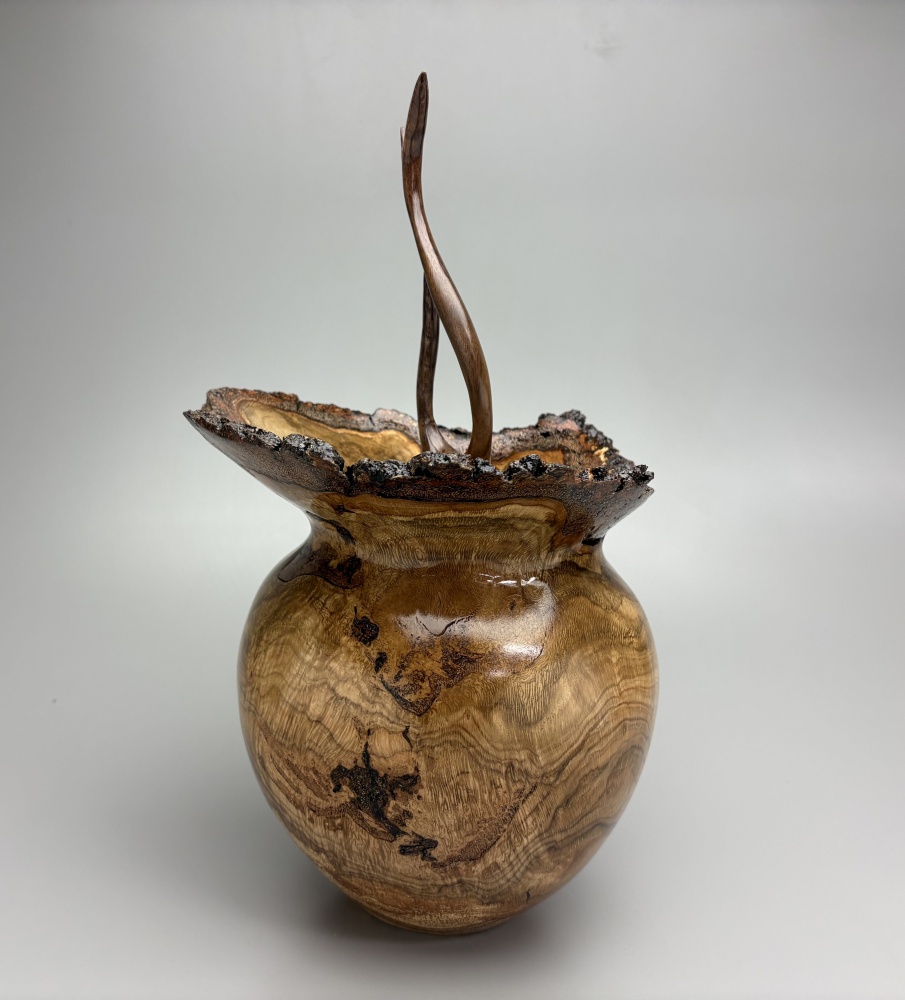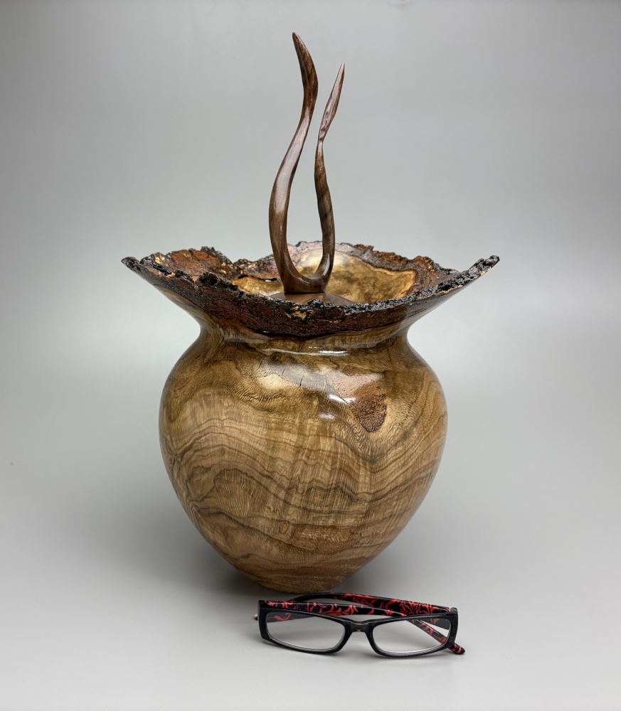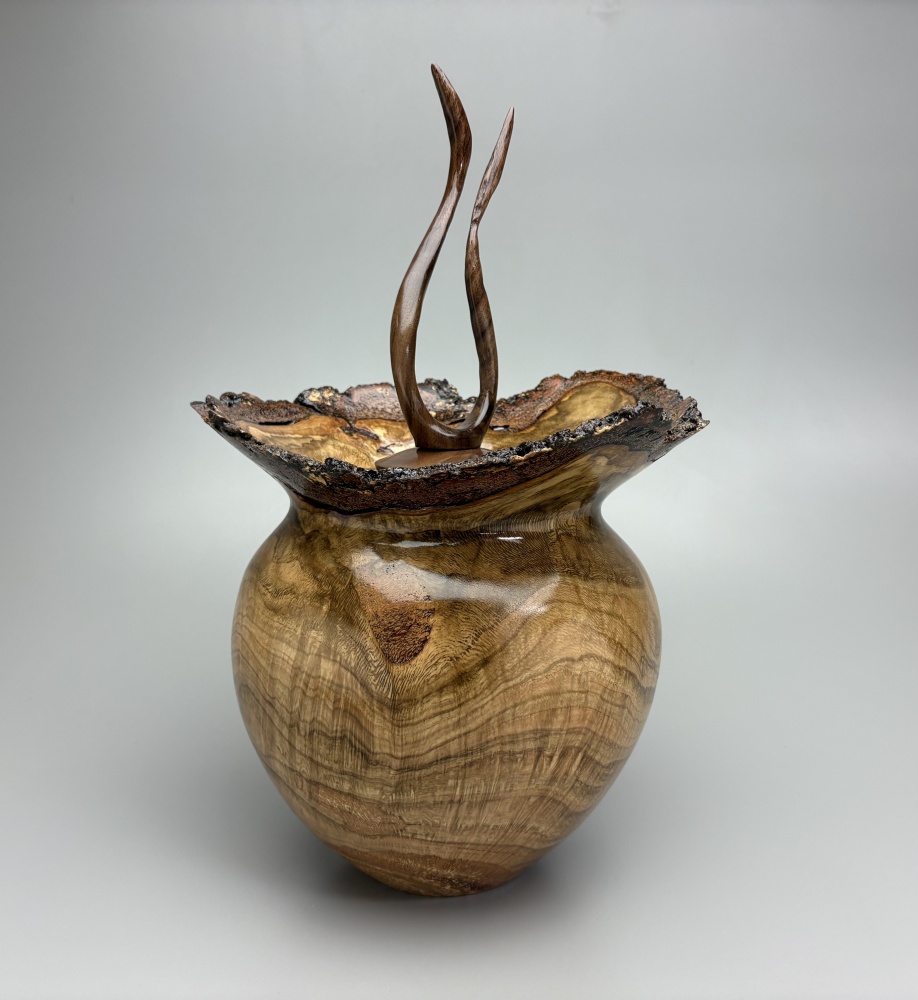 This burl came from a local Red Oak tree that fell. It is estimated to be over 200 years old. The top is a hand carved flame finial.