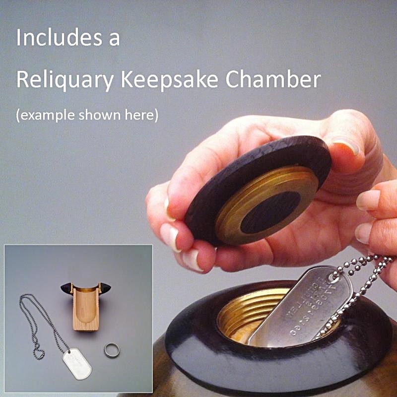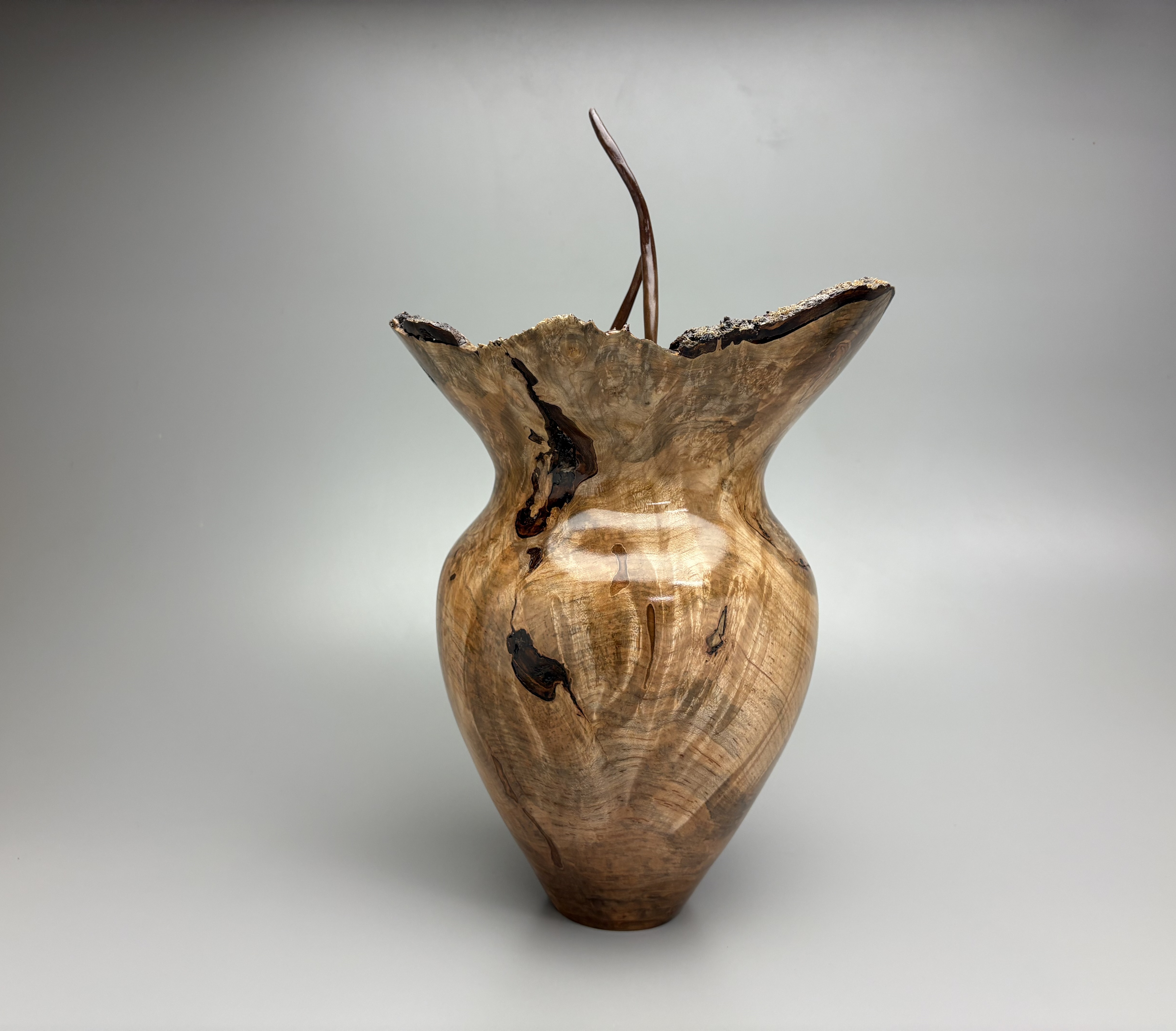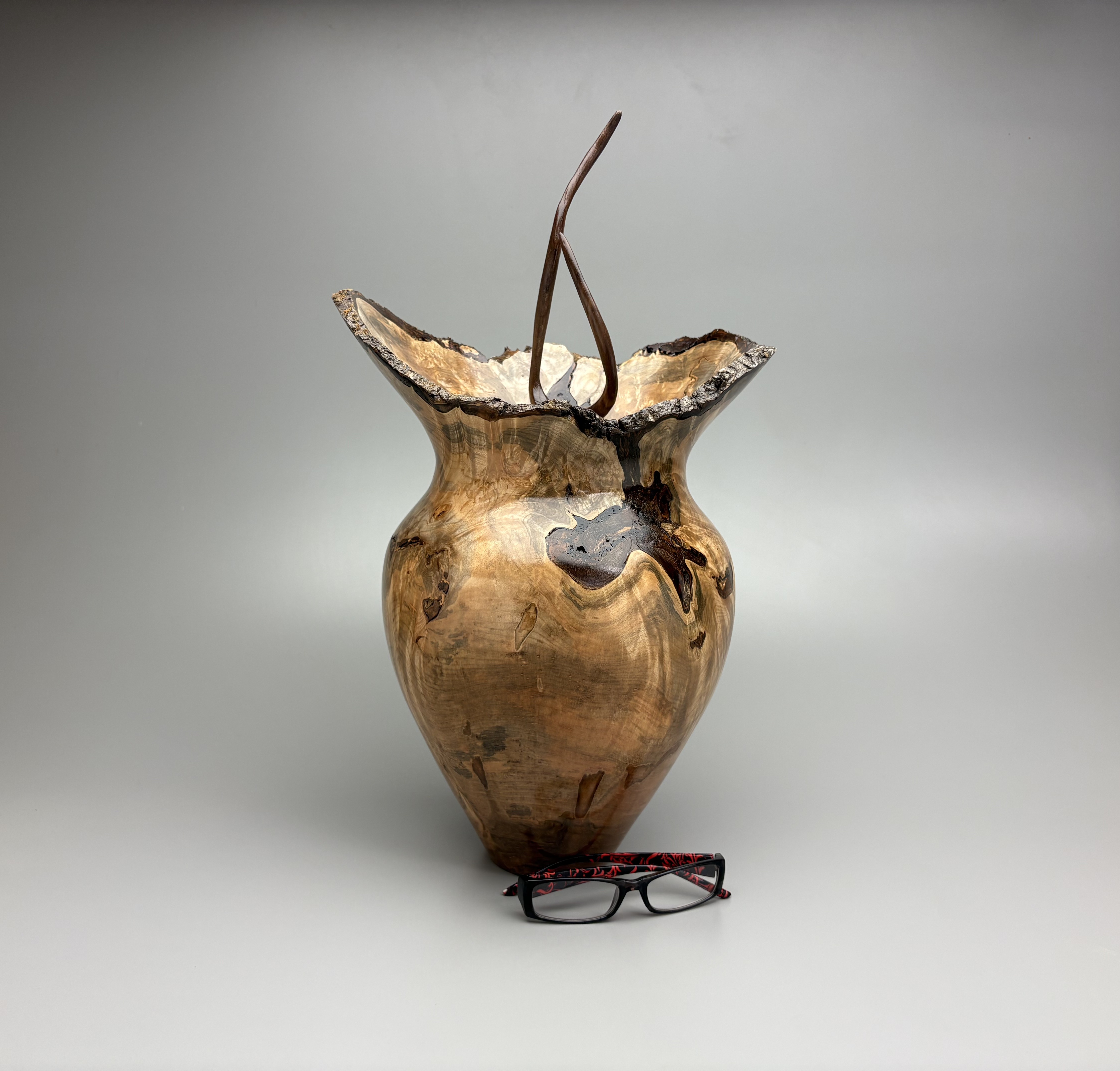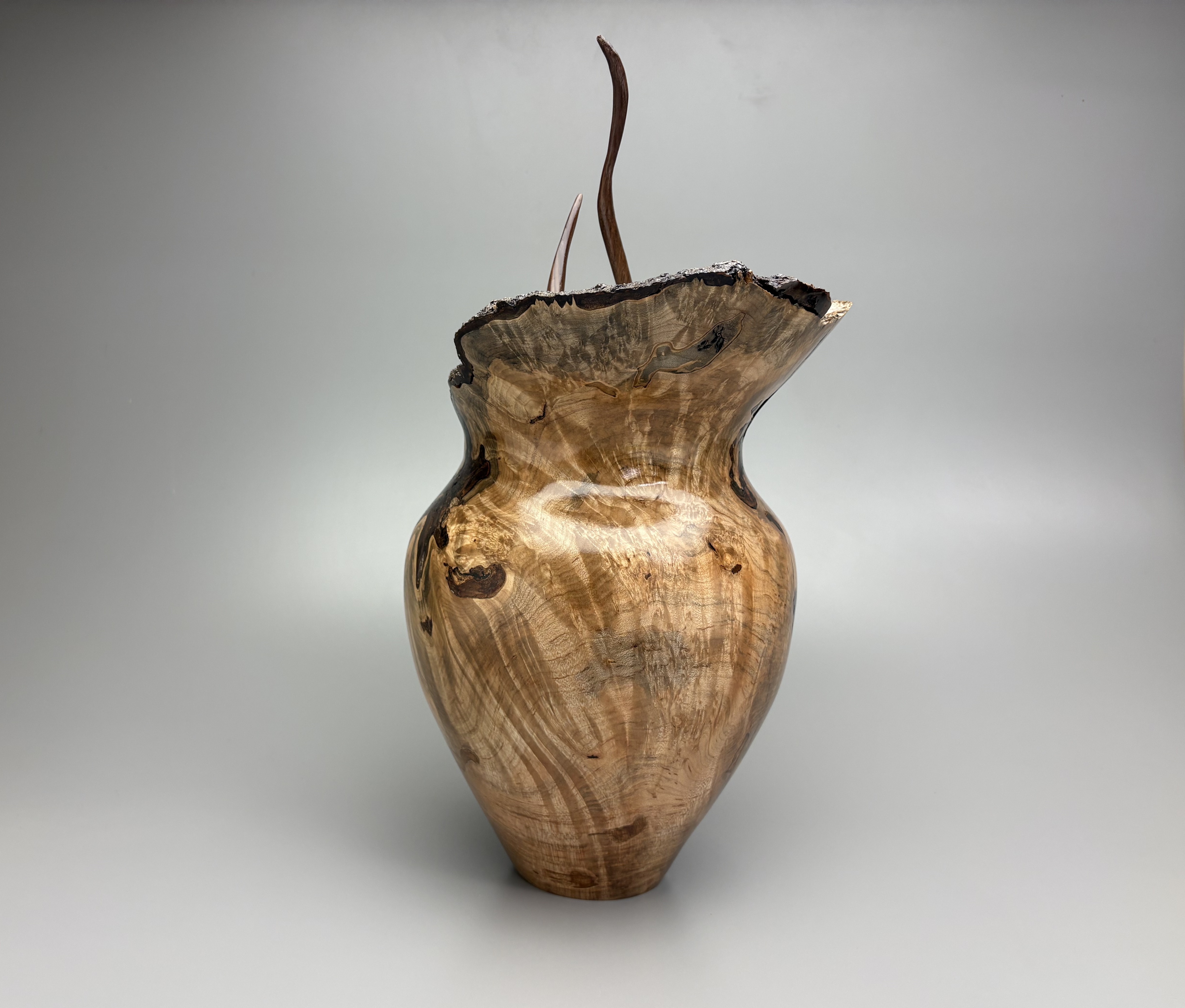 This urn is made from Maple wood, an American favorite. Best known for syrup and displays of red, orange and yellow each fall, Maples grow throughout the Eastern and Central United States. Trees can reach 130 feet tall and the wood color varies from creamy white to grey to reddish-brown depending on the species. This piece includes Burl wood, an explosion of cellular growth, which yields highly figured and unique patterning prized for its beauty and rarity.